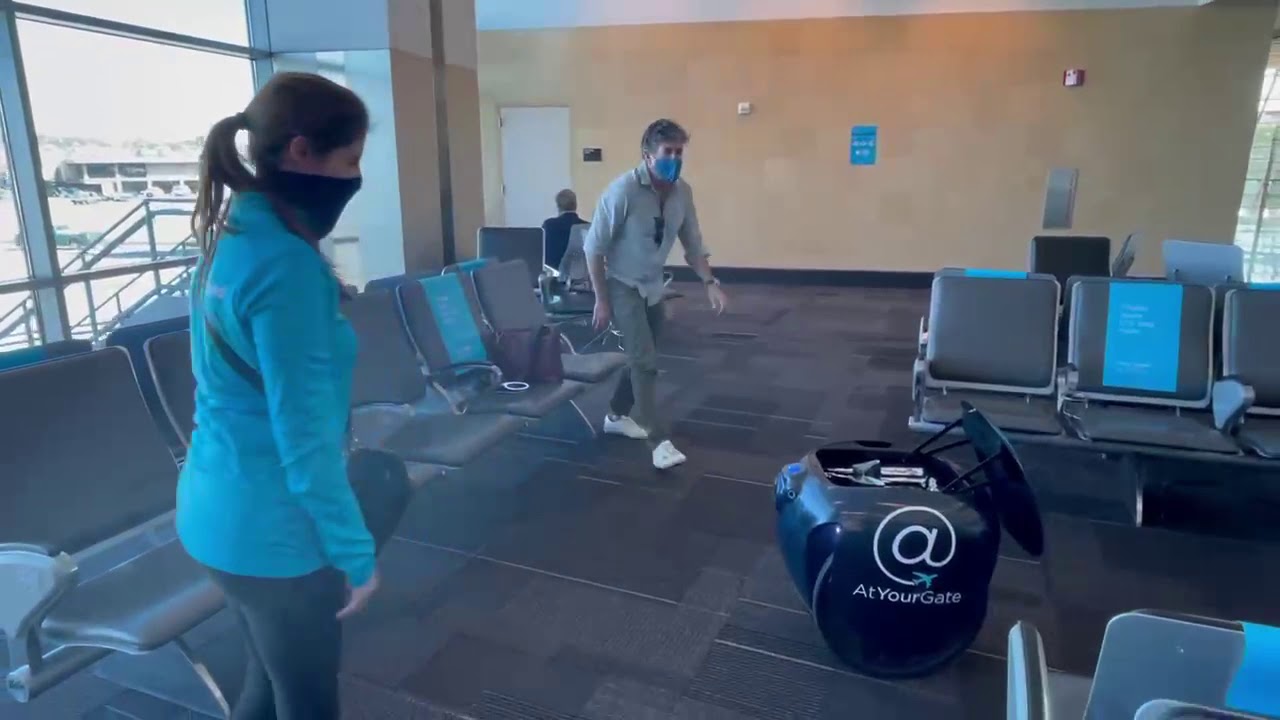 At San Diego International (SAN), one of the airports where AtYourGate employees deliver food and retail items, a small robot can be spotted following about three feet behind humans on their way to make deliveries. When the time comes to hand over the order, the AtYourGate employee pushes a button to open the robot’s lid and then steps away to allow the customer to reach into the storage bin and pick it out themselves.